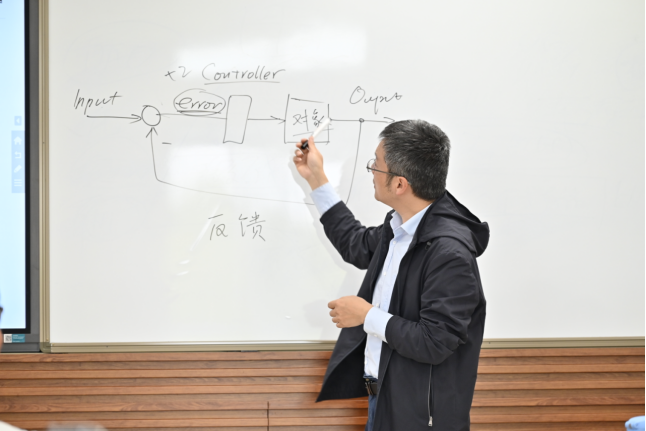 接着,赵舵将热力学第二定律与负反馈控制系统模型融入讲解之中。首先借助熵增定律的深刻内涵,启发同学们认识到日常生活与工作中积极追求秩序与条理的重要性,他引用了薛定谔在《生命是什么》中的名言——“生命以负熵为生”,借此强调了日常学习和生活中自律的重要性。他通过分析负反馈控制系统的原理,进一步引导同学们学会在日常工作实践中,要牢固树立明确目标、制定标准、学会协同折中以及注重反馈与持续改进的意识。